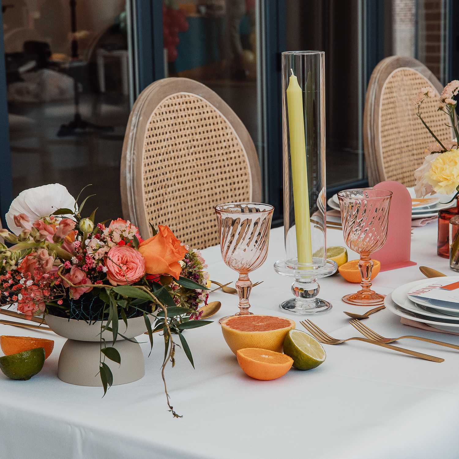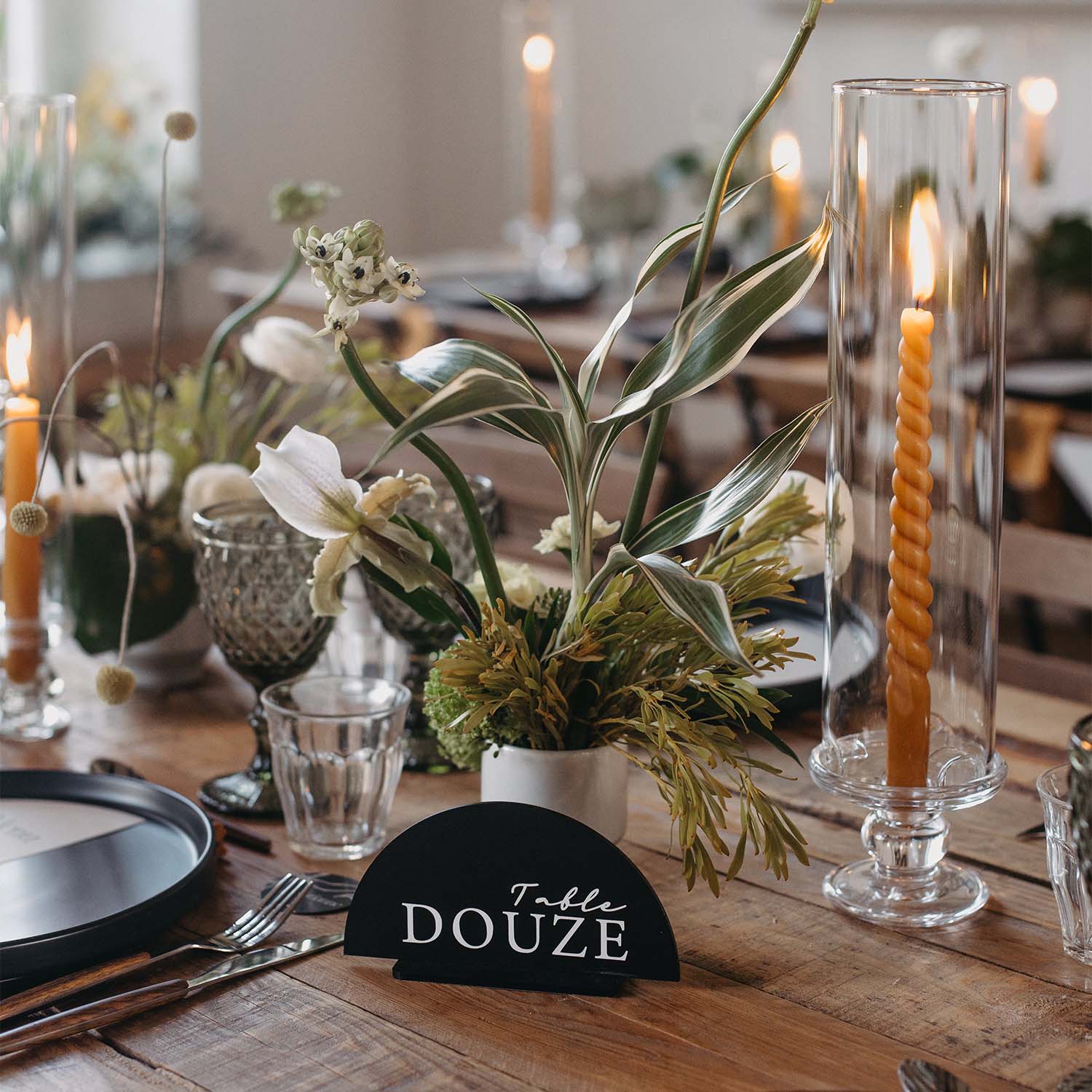 Ces bougeoirs pourront se marier à de nombreuses couleurs de part leur transparence; Ils s'adapteront tout particulièrement aux tables présentant une dominante de couleurs douces avec beaucoup de fleur fraiche. Optez pour des tailles et formes diverses. Accrochez un jolie papeterie (petite étiquette) sur certains bougeoirs. Vous pouvez ajouter le cylindre en verre autour de la bougie (loué séparément en différentes hauteurs), vous pourrez ainsi placer les bougeoir au milieu de vos fleurs.