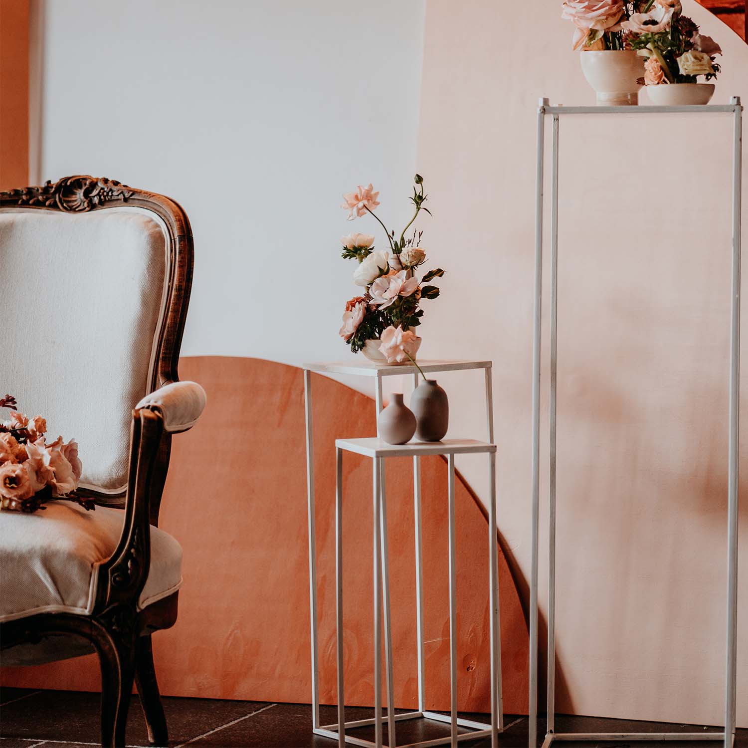 Ces sellettes en métal de couleur blanche trouveront leur place au pied du panneau d'accueil, à l'entrée d'une salle ou d'une cérémonie, au pied d'une arche, à côté d'un canapé... Vous pourrez les garnir de belles compositions florales.