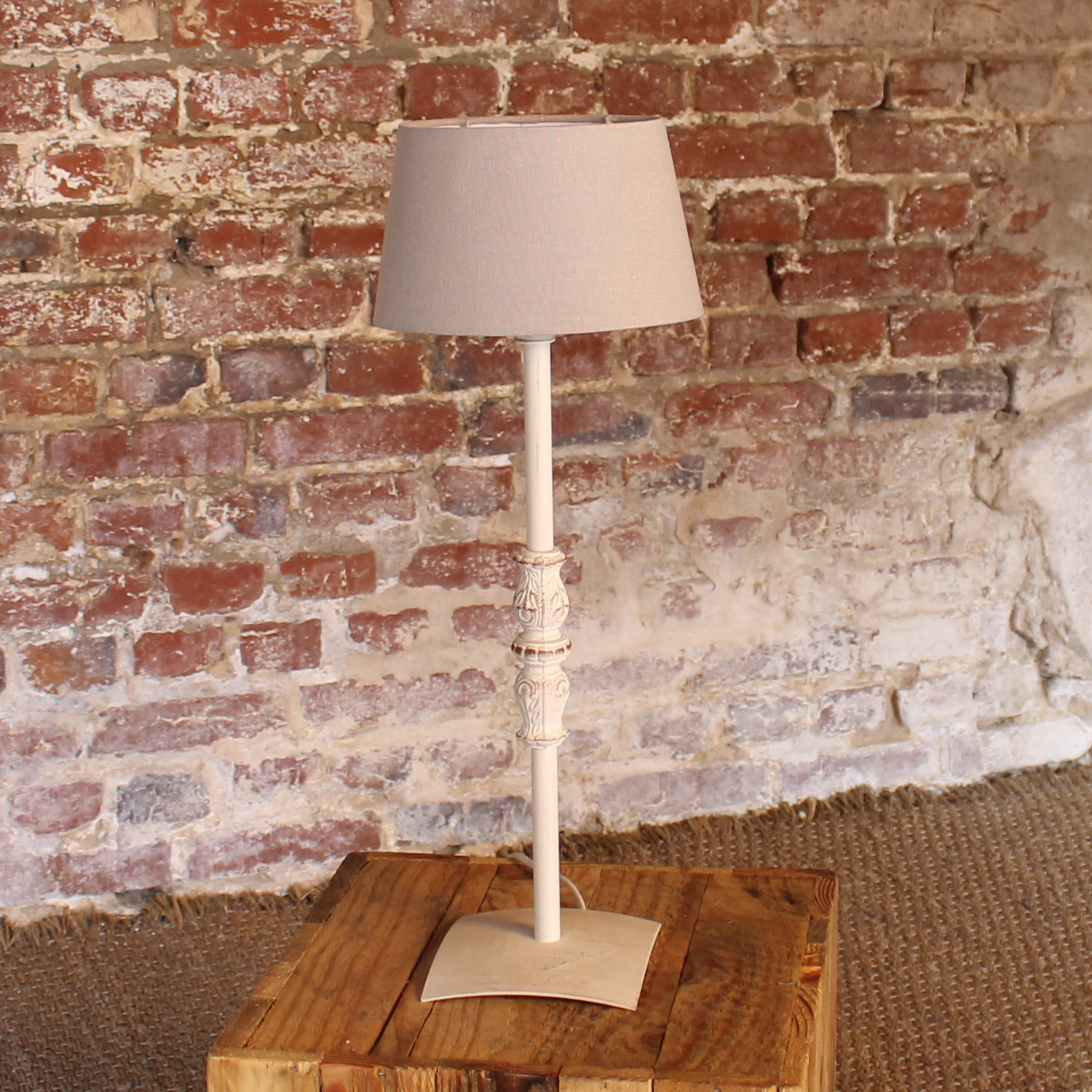Lampe en métal blanc patiné avec petit abat jour gris