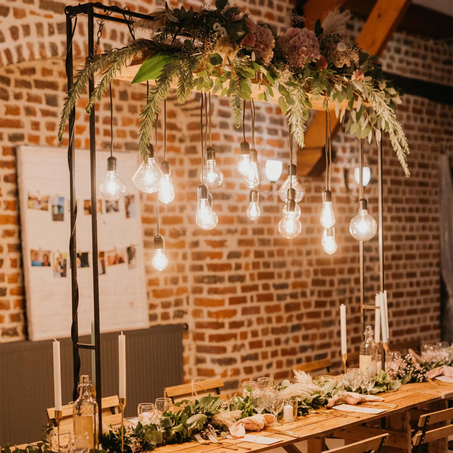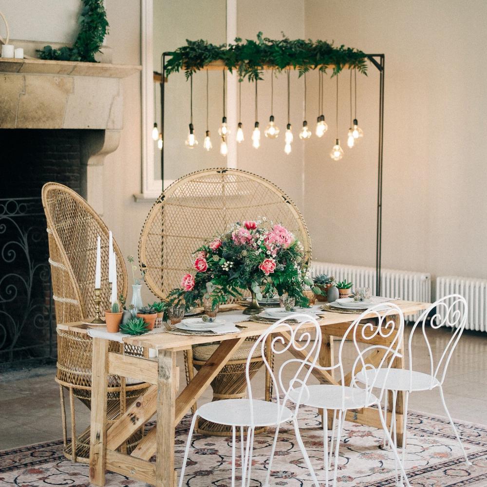 Utilisez cette arche en intérieur pour y attacher la suspension d'ampoules. Sinon habillez-la de feuillage vert ou feuillage aux couleurs automnales. Elle pourra également être placée à l'arrière ou au dessus d'une table d'honneur puisque notre table champêtre passe pile en dessous, ou au dessus d'un buffet. Vous pourrez sinon l'utiliser pour un décor de photobooth auquel vous suspendrez un rideau lumineux, des fleurs séchées, du ruban, des cerceaux fleuris, etc...