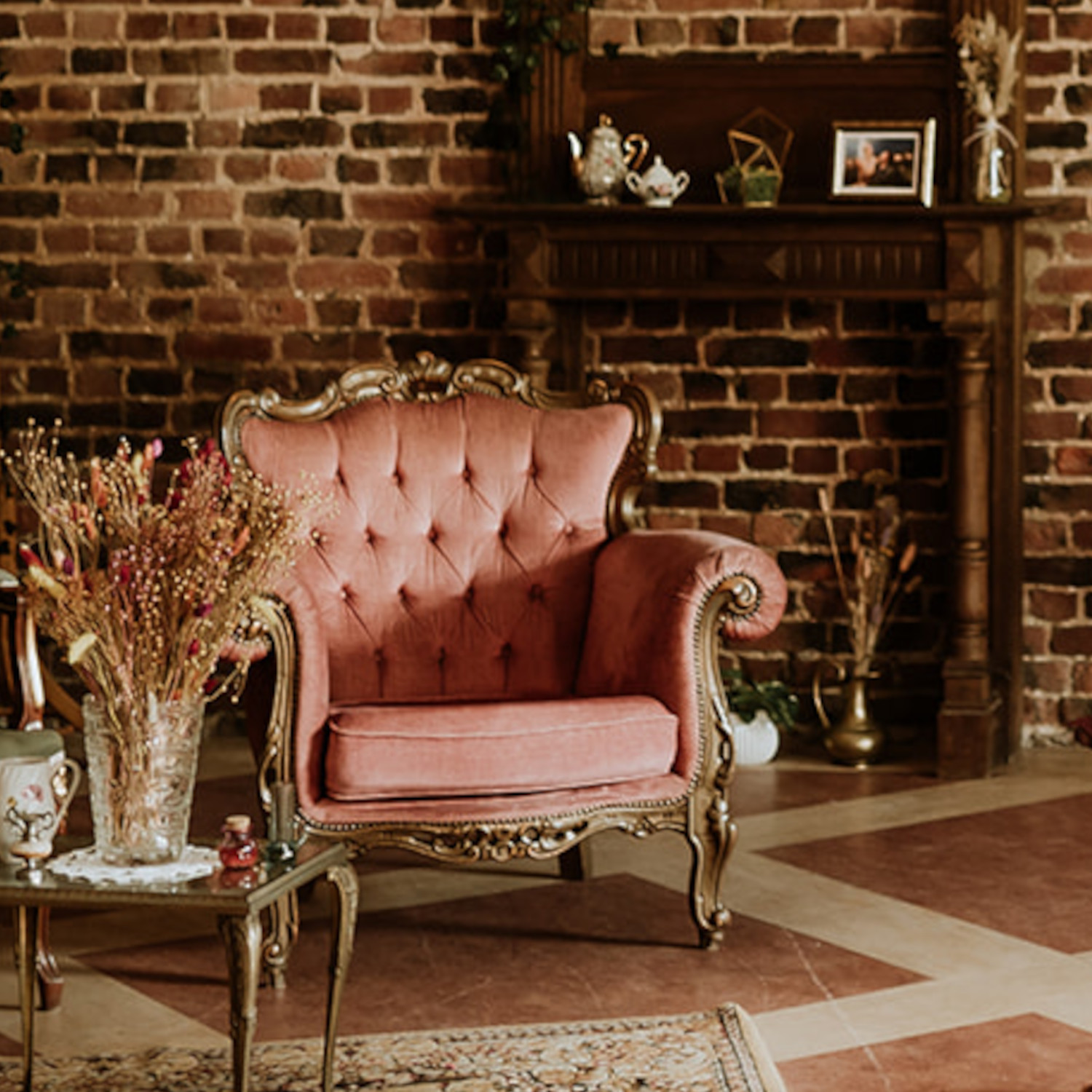 Assises en velours capitonné, couleur rose framboise, avec un contour en bois doré