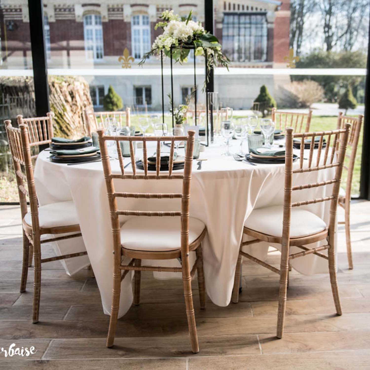 Minimum de commande: 5 Unités. La chaise Tiffany bois cérusé (couleur bois très légèrement blanchi) apporte douceur et luminosité à vos tables. Retrouvez, avec ces chaises, l'authenticité du bois sans le côté trop rustique des bois moyens ou foncés. Ici la teinte reste douce. Avec ses barreaux très fins, elle offre un design chic et s'adapte aux mises en scène modernes, romantiques et classiques. Pour faciliter leur transport, les chaises s'empilent. Louées avec le coussin d'assise en sky, compris dans le tarif.