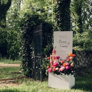 Ce panneau vertical est doté d'un bac sur le devant qui pourra accueillir une très belle composition florale. Le stickers "Bienvenue au mariage de" est permanent. Il ne vous reste plus qu'à ...