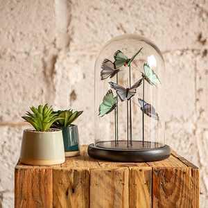 Véritable papillon sous globe en verre exposé digne d'un cabinet de curiosités. Attention: cet objet est bien plus petit que semble ne le montrer la photo, voir 2eme photo sur le bureau...
