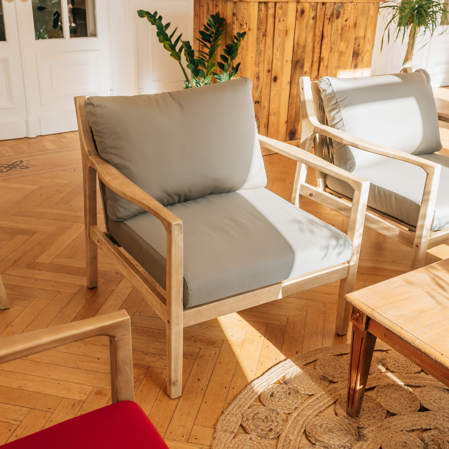PRO-FAU-acc-K 23,00 € HTAssises pour vos espaces lounge intérieurs ou extérieurs par temps sec. Vous sélectionnez ci la structure fine en bois d'acacia seule, ajoutez ensuite les coussins d'assise et de dossier du coloris de votre choix ICI