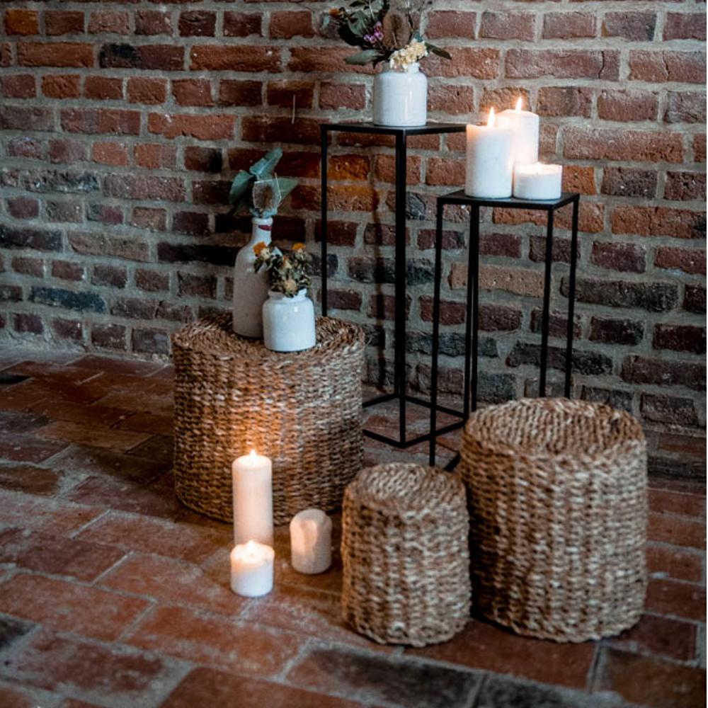 Lot composé de pots en osier de hauteur et de diamètre variés. Vous pourrez les utiliser retournés, comme sur la photo pour apporter quelques petites touches d'osier dans votre décor ou au pied de votre arche.