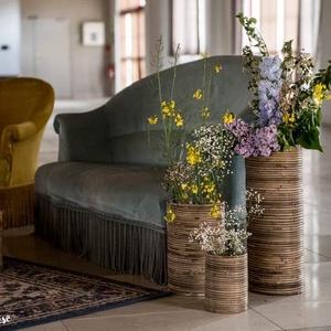 Lot composé de pots en osier de hauteur et de diamètre variés. Vous pourrez les utiliser retournés, comme sur la photo pour apporter quelques petites touches d'osier dans votre décor ou au pied ...