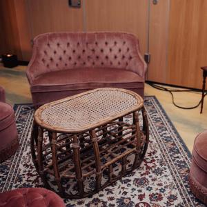 Jolie table basse ovale en rotin à intégrer dans vos espaces lounge, avec assises en velours colorées ou assises en rotin ou encore assises en lin blanc.
