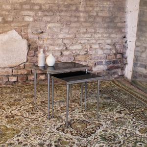 Originalité pour ces belles tables gigognes dessus cuir rouge foncé. Celles-ci donneront beaucoup de caractère à vos salons d'hiver