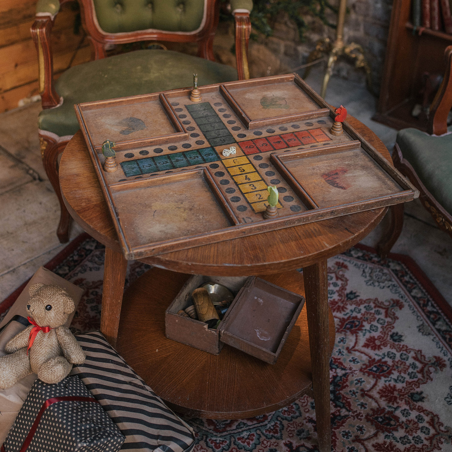 Table ronde vintage avec plateau intermédiaire, de couleur bois foncé, dans un style qui rappelle celui des années 1970.