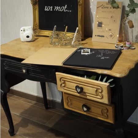 Pour plus de modernité, les poignées en forme de coeur de ce bureau ont été remplacées par des poignées demies lune couleur bronze.