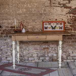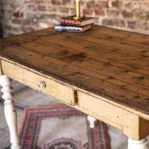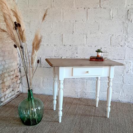 Table ancienne avec un charme fou. Vous aimerez sa peinture blanc vieilli sur les pieds, légèrement écaillée par le temps, ainsi que son plateau en bois brut .