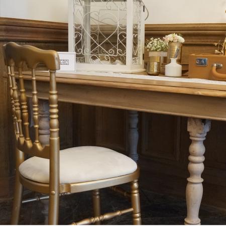 Elégant bureau en chêne ciré, une pièce authentique pour mettre en valeur l'espace voeux/livre d'or.