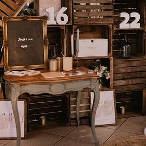 Choisissez cette table pour votre espace vœux, placez y un peu de déco et votre livre d'or, une jolie assise et laissez vos invités vous écrire leurs messages. Elle pourra également être ...
