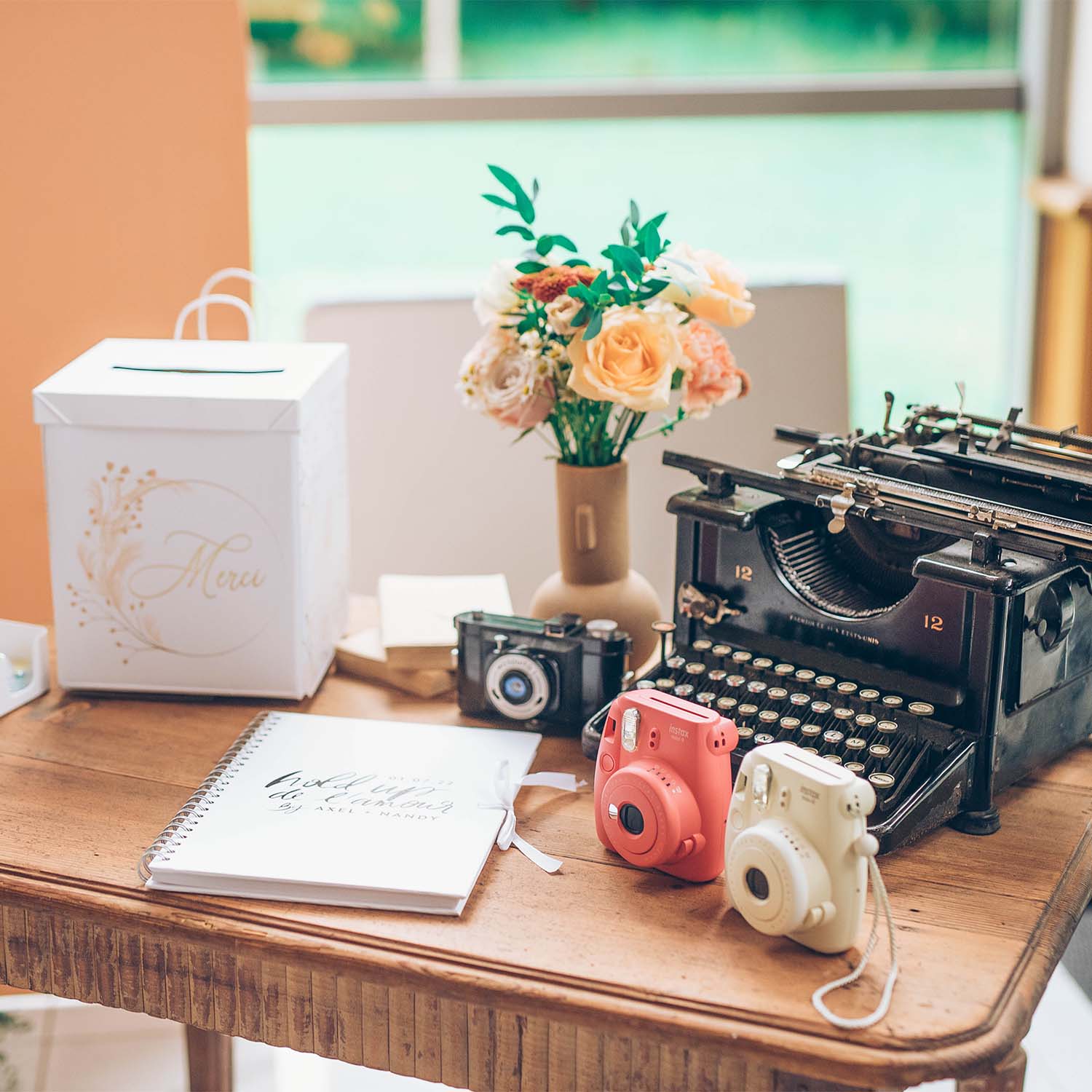 La table Sylvain, de taille moyenne pourra recevoir votre urne + votre livre d'or. En bois plutôt foncé, elle trouve sa place sur les mariages aux murs en brique. Vous l'associerez à des accessoires dorés, cuivrés, du lin, du vieux vert, du feuillage, des vases fumés marrons, etc...