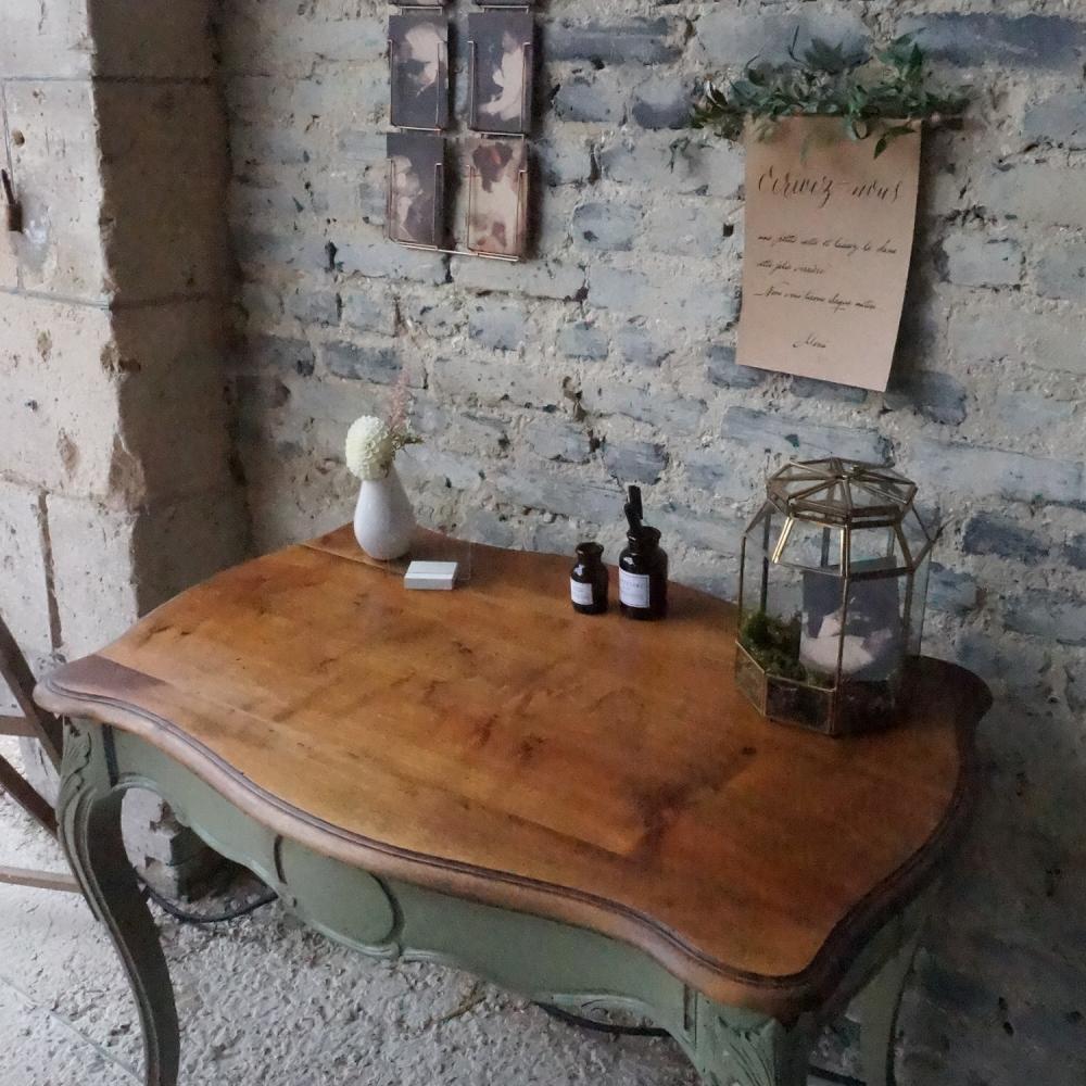 Beaucoup d'élégance pour cette table aux pieds dans les tons vieux verts. De taille idéale pour un livre d'or ou pour une urne, vous pourrez poser des accessoires anciens de couleur dorée, mais aussi des accessoires en verre tansparent ou des vases en verre brun, du feuillage, des fleurs blanche etc...La chaise thonet lui conviendra parfaitement.