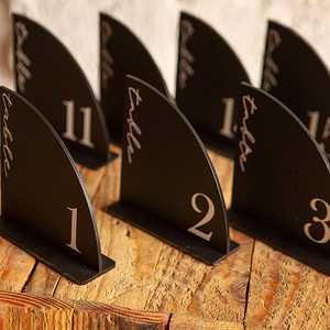 Numéros de table en plexi noir, par lot de 1-10 puis lots de 4 pour les tables suivantes, avec socle, avec le mot table et le numéro en stickers blanc, réalisés par Izii ...