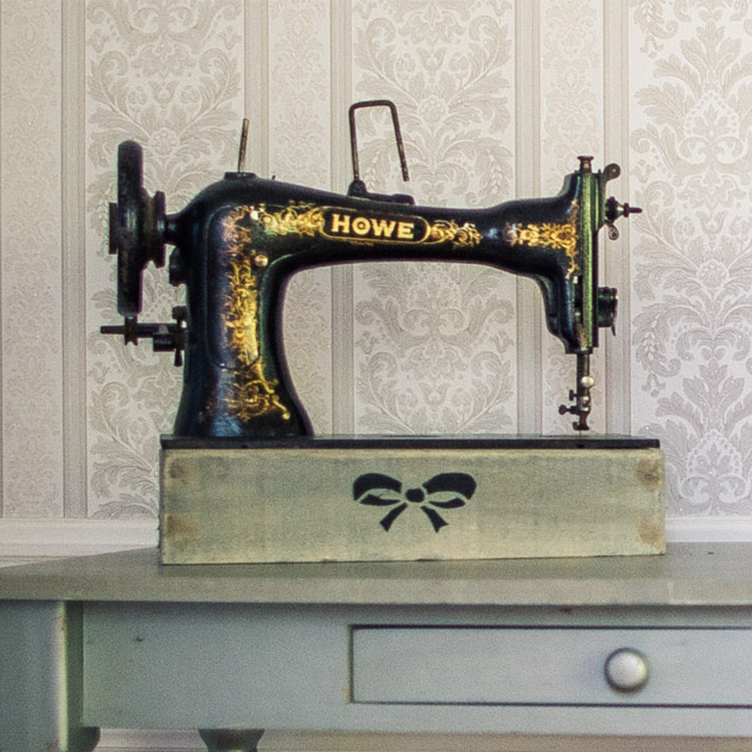 Ancienne machine à coudre disposée sur un pied en bois patiné pour un thème mode/couture ou rétro.