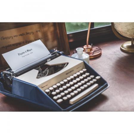 Machine à écrire des années 70, sur laquelle vous pouvez glisser une feuille avec vos prénoms et la date. Machine non fonctionnelle.