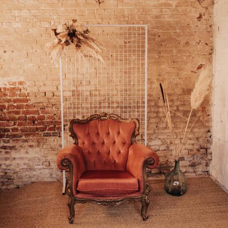 Très beau porte-manteau en laiton pour apporter du caractère à une mise en scène vintage ou gatsby, pour un espace photobooth ; un salon gatsby intérieur avec assises british.