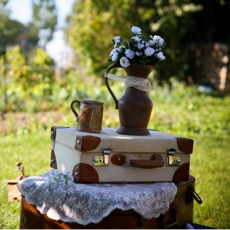 Un esprit ancien mais tendance, cette malle est parfaite pour agrémenter un espace photobooth; un coin de salle ou l'accueil, en jouant sur l'effet "lot" de plusieurs malles et valises empilées.